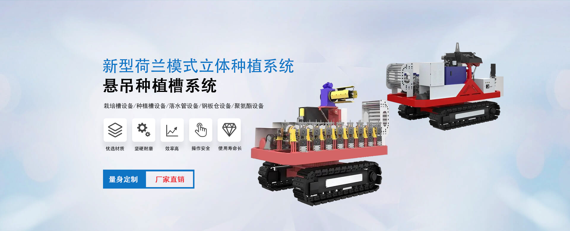 雄博機(jī)械主營(yíng):種植槽設(shè)備/栽培槽設(shè)備/草莓栽培槽/新型立體種植槽/草莓無(wú)土栽培設(shè)備/草莓立體種植系統(tǒng)/懸吊種植槽系統(tǒng)/落水管設(shè)備/鋼板倉(cāng)設(shè)備/聚氨酯設(shè)備等。