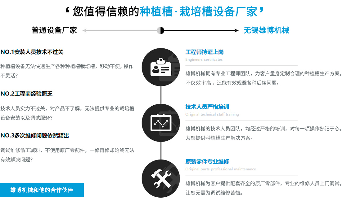 您在選擇雄博產(chǎn)品的同時(shí),也選擇無(wú)微不至的終身服務(wù)。可根據(jù)不同客戶(hù)實(shí)際需求進(jìn)行種植槽設(shè)備,栽培槽設(shè)備等的特殊工藝設(shè)計(jì)制造專(zhuān)業(yè)一對(duì)一售前/售后/技術(shù)咨詢(xún)指導(dǎo),享受更貼心/放心的設(shè)備使用體驗(yàn)。
